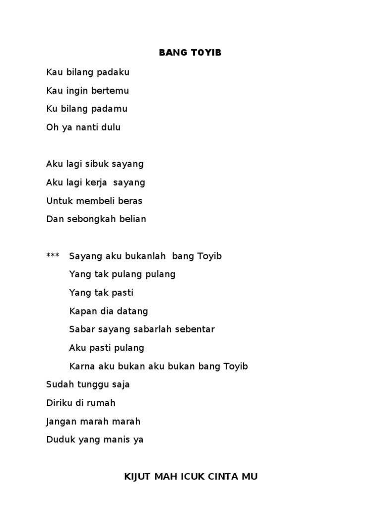 Bang toyib Bang toyib Kenapa tak pulang pulang anakmu anakmu panggil panggil namamu Bang toyib Bang toyib Kenapa tak pulang pu. Bang toyib Bang toyib Kenapa tak pulang pulang anakmu anakmu. Bang Toyib bang Toyib Mengapa tak pulang pulang Anakmu anakmu Panggil panggil namam.